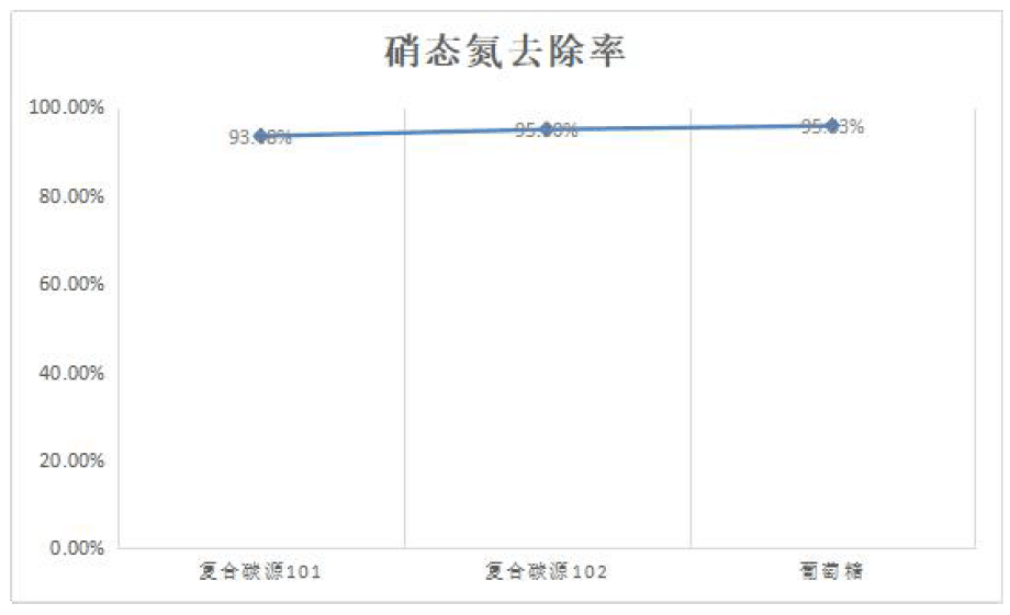 某水務企業,硝態氮29mg/L,碳源投加量0.1%下,硝態氮的處理效果對比。使用我司復合碳源的硝態氮去除率與葡萄糖的效果相近。